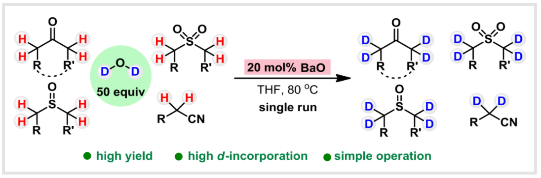 Fan, Huike, Yang, Sen.; Li, Junhua.; Teng, Qiaoqiao.; and Chen, Ming.*BaO-Catalyzed α-Deuteration of Ketones, Sulfones, Sulfoxides, and Nitriles.Eur. J. Org. Chem.2022, e202201218.